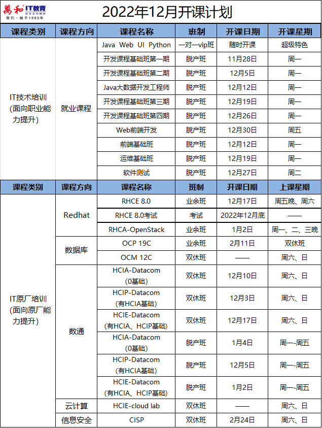 2022年即将远去 也许,在忙碌中劳累了自己 也许,在追逐中迷失了自己 也许,在无聊中打发了自己 但是这一切都不要在意 现在开始,一切都还来得及 万和IT教育12月开课计划新鲜出炉,从今天开始为梦想全力以赴吧。
