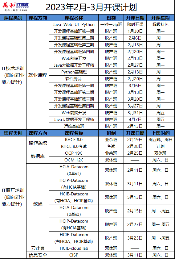 春节假期已经结束,在新的一年里大家要以饱满的精神状态迎接学习生活呦~ 2023让我们领跑新学期,再创新佳绩! 万和IT教育2月开课计划新鲜来袭!