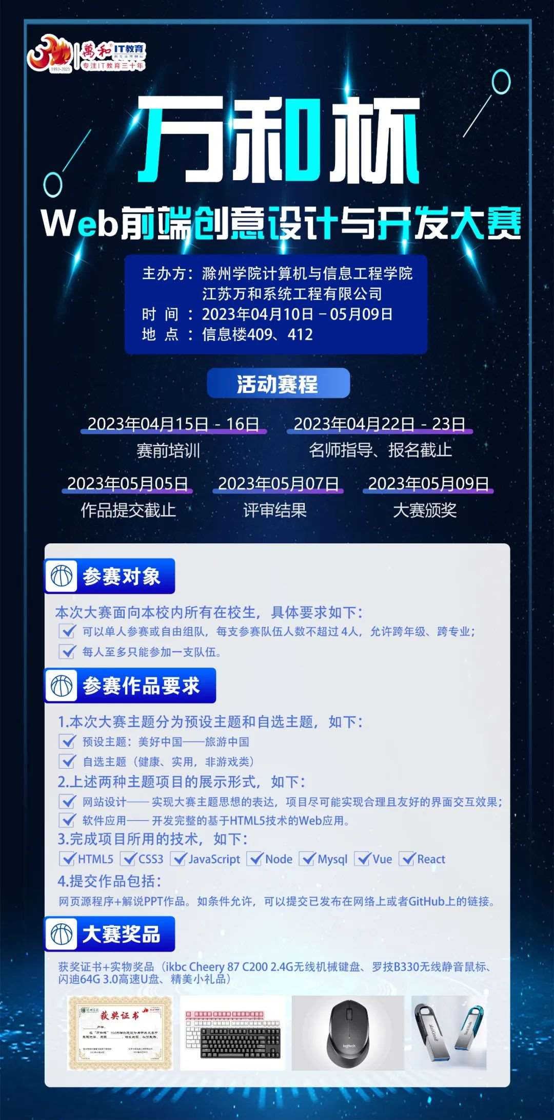 随着互联网的快速发展,Web前端技术的应用范围不断扩大,越来越多的企业和组织需要建立自己的网站和移动应用。同时,移动互联网的普及也加速了Web前端技术的发展。 为了更好地培养学生Web前端开发知识,提升技术实践能力,滁州学院计算机与信息工程学院与江苏万和系统工程有限公司一起主办 “万和杯” Web前端创意设计与开发大赛。