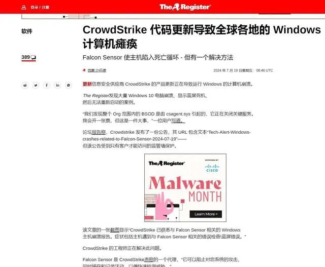 微软发言人表示:“我们了解到,影响Windows设备的问题源自一家第三方软件平台的一次更新。我们预计很快会解决这个问题。” 这家软件平台就是美国网络安全公司CrowdStrike,其Falcon Sensor安全产品的更新导致了Windows电脑蓝屏现象。
