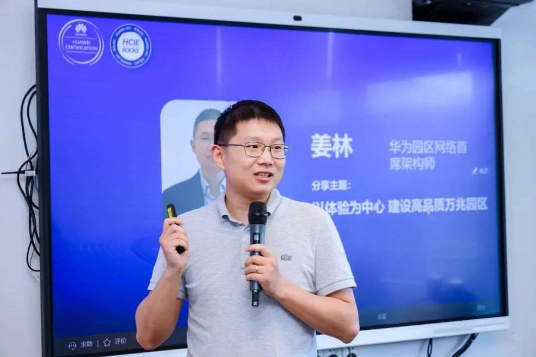 华为JDC平台负责人杨阳做主题分享华为园区网络首席架构师姜林以“以体验为中心,建设高品质万兆园区”为主题,向现场的HCIE专家分享了华为以体验为中心的高品质万兆园区网络建设方案。他指出:“面向体验建网的时代,我们不仅要保障网络正常工作,更要从无线体验、应用体验、运维体验三个维度提升组网品质。依托Wi-Fi 7带来的超帧抢占、逐包功控,自研芯片带来的应用识别、调度和随流检测,依托AI和大数据的数字地图,带来全方位体验升级且绿色节能低碳的数字园区。”