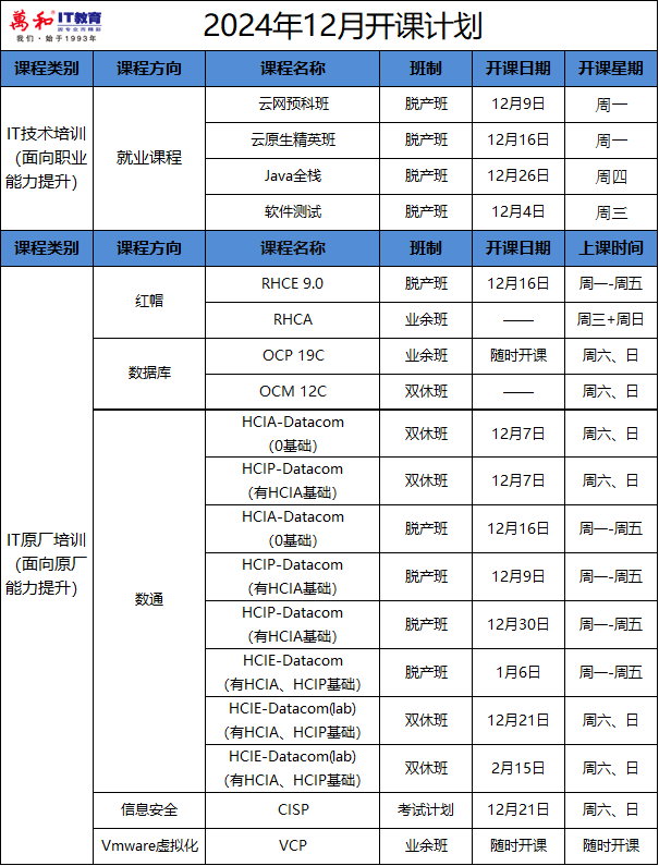 随着年末的脚步渐行渐近,我们万和在这个充满希望的12月,为你精心准备了一系列丰富多彩的IT培训课程。无论你是初学者还是希望进一步提升技能的进阶者,这里都有适合你的课程!