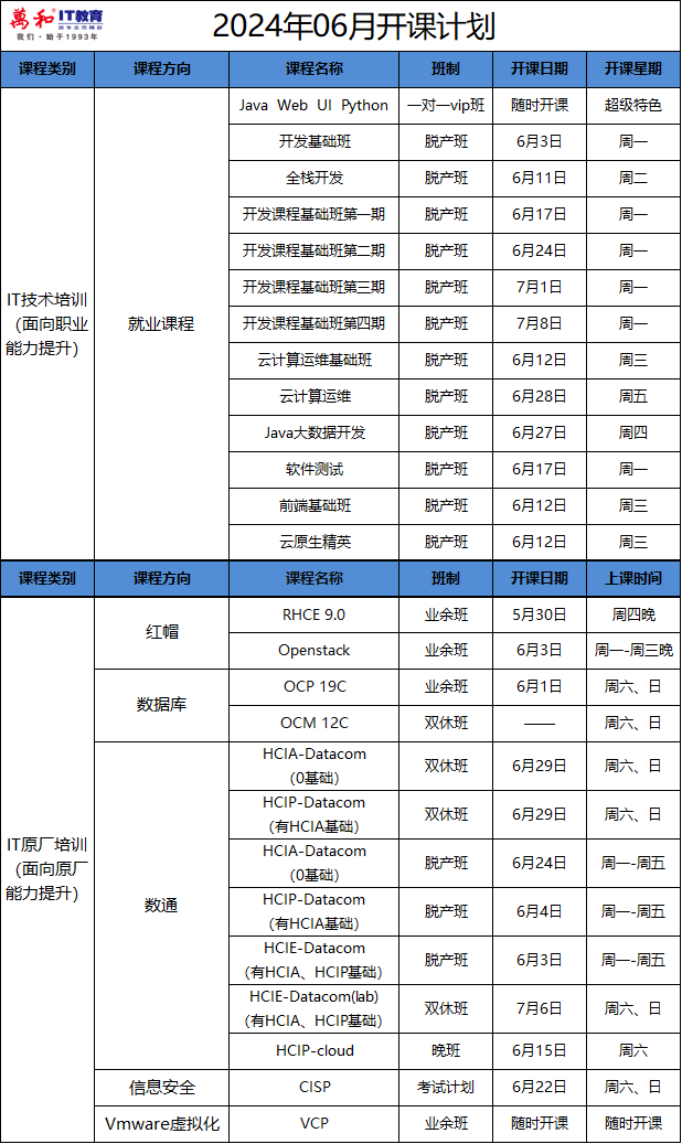 随着信息技术的快速发展和市场竞争的日益激烈,掌握IT技能已经成为当今社会不可或缺的竞争力。为了满足广大学员的学习需求,我们经过精心筹备,推出本月的培训课程。如果,你此刻站在就业的分岔路口,不知该何去何从;如果,你还在惆怅迷茫,不妨来万和看看吧!
